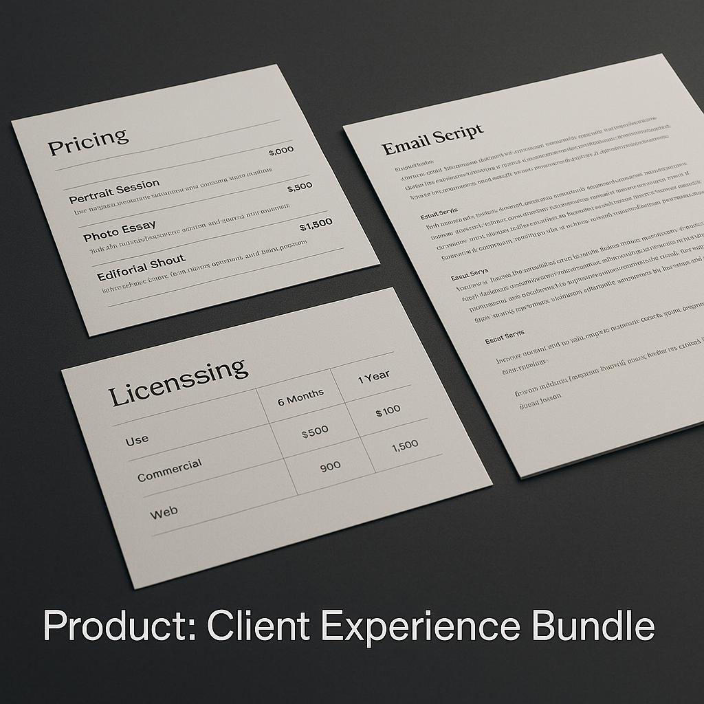 Client‑facing templates and calculators that clarify scope, licensing, pricing and delivery. Includes discovery questionnaire, scope & revision matrix, licensing tiers, 18 email scripts, pricing calculators (time, assistants, gear, post, markup) and delivery checklist & archiving SOP. Raises average order value and reduces revision loops.